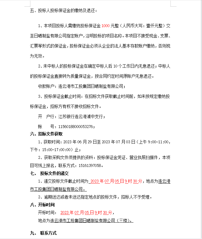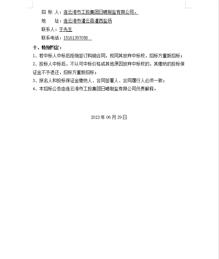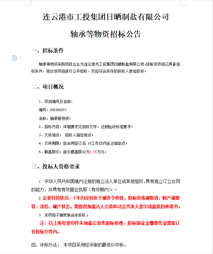 连云港市工投华体会(中国)日晒制盐有限公司轴承等物资招标公告