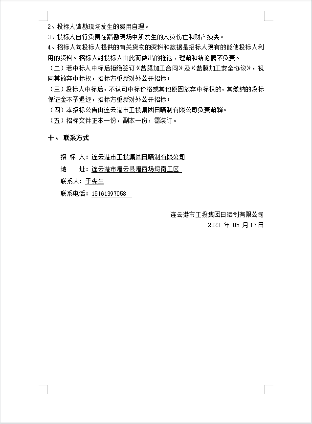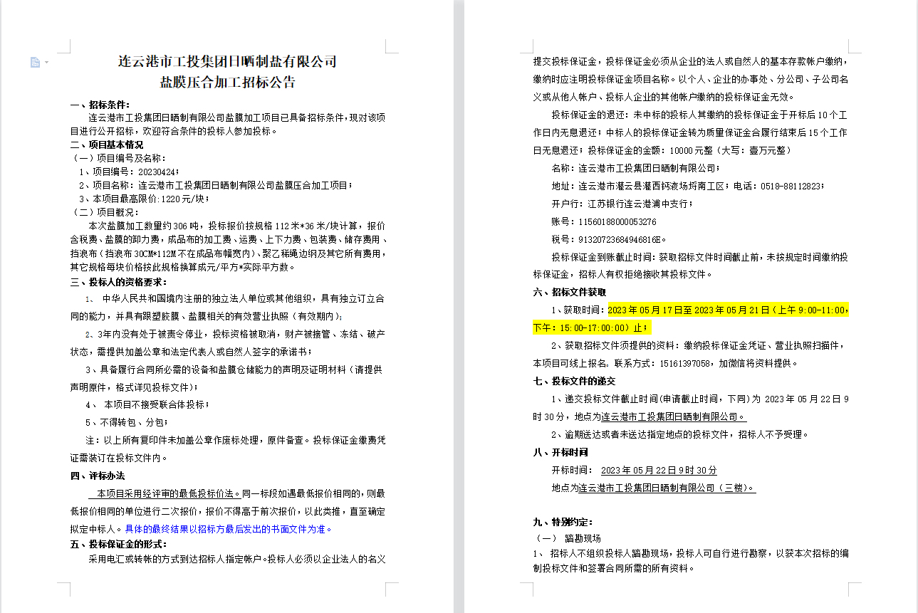 连云港市工投华体会(中国)日晒制盐有限公司盐膜压合加工招标公告