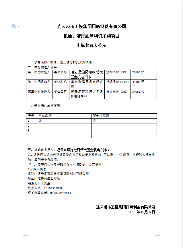 连云港市工投华体会(中国)日晒制盐有限公司机油、液压油等物资采购项目中标候选人公示