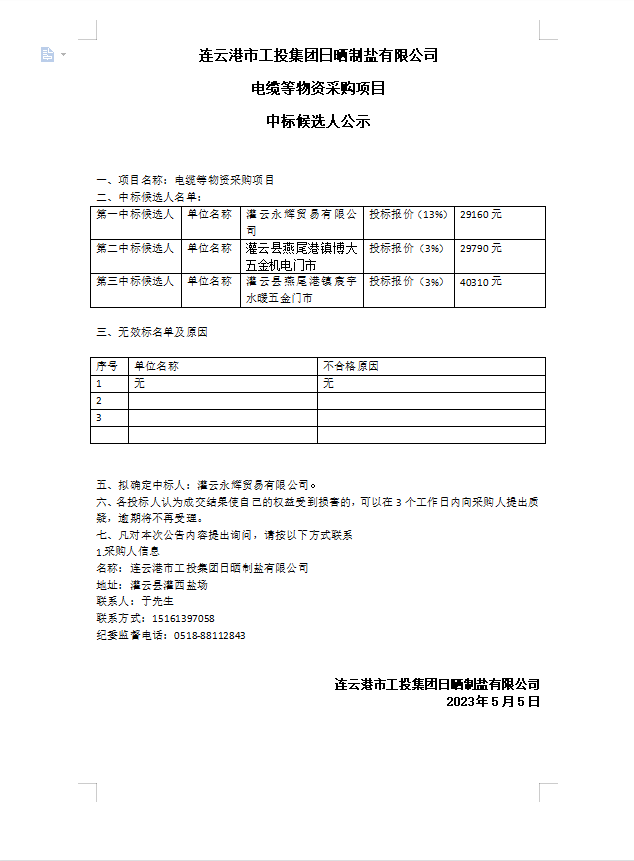 连云港市工投华体会(中国)日晒制盐有限公司电缆等物资采购项目中标候选人公示