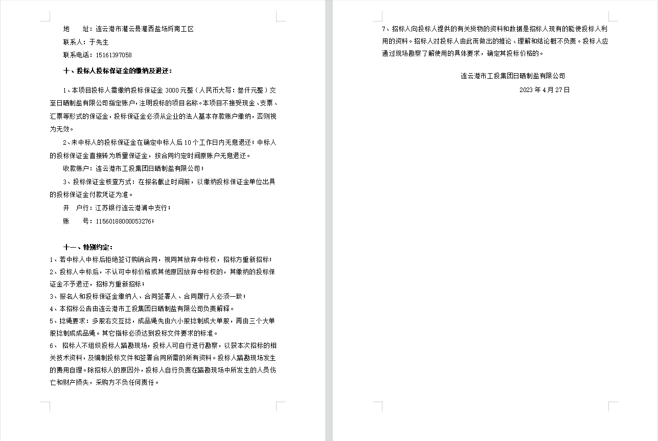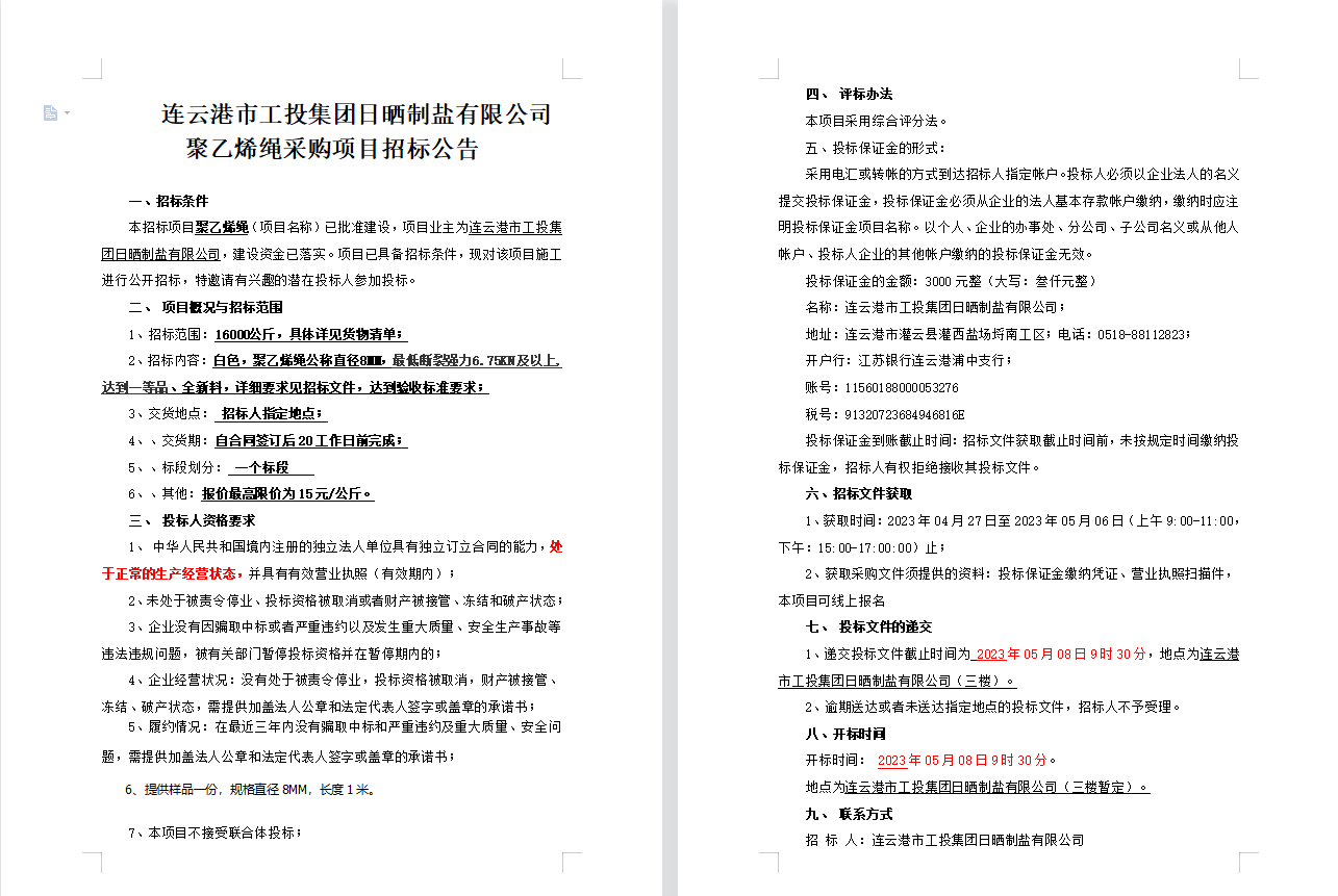 连云港市工投华体会(中国)日晒制盐有限公司聚乙烯绳采购项目招标公告