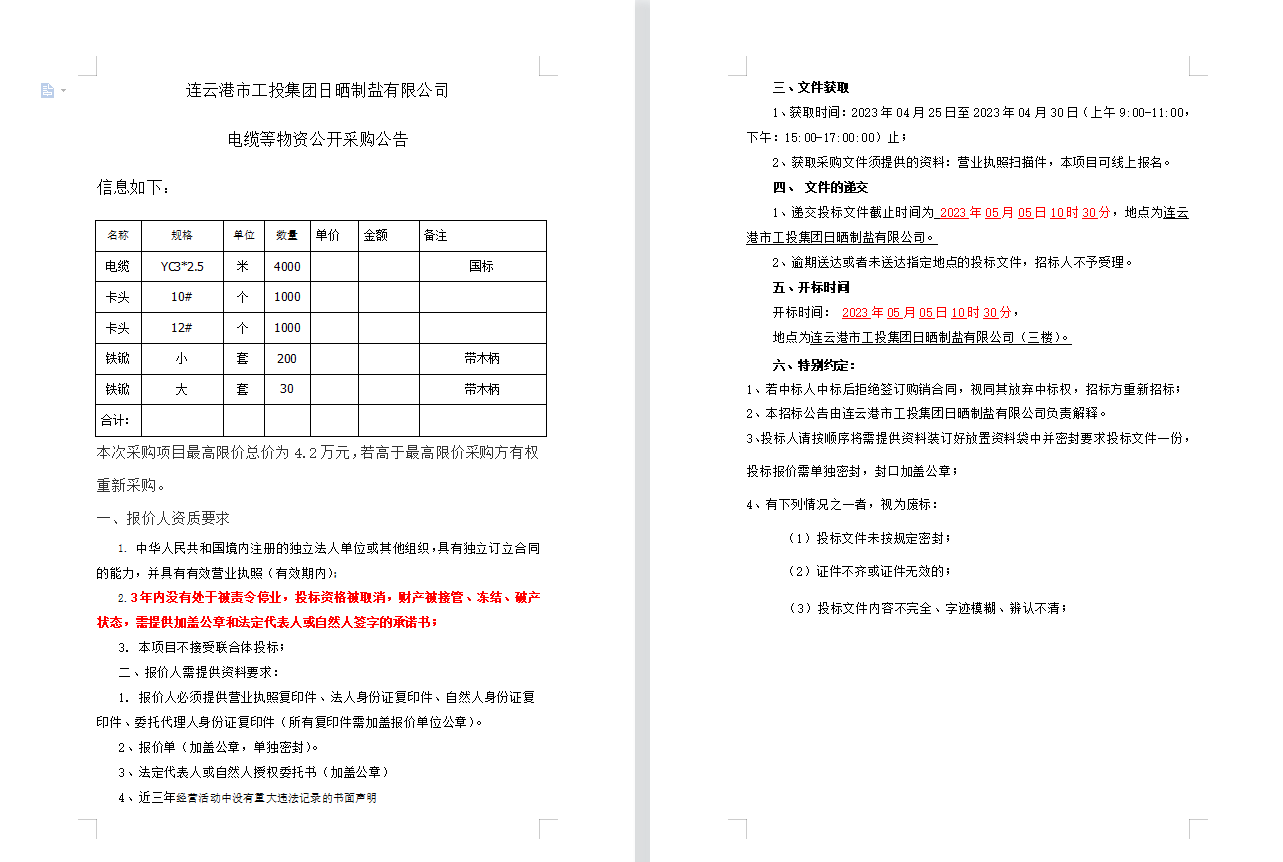 连云港市工投华体会(中国)日晒制盐有限公司电缆等物资公开采购公告