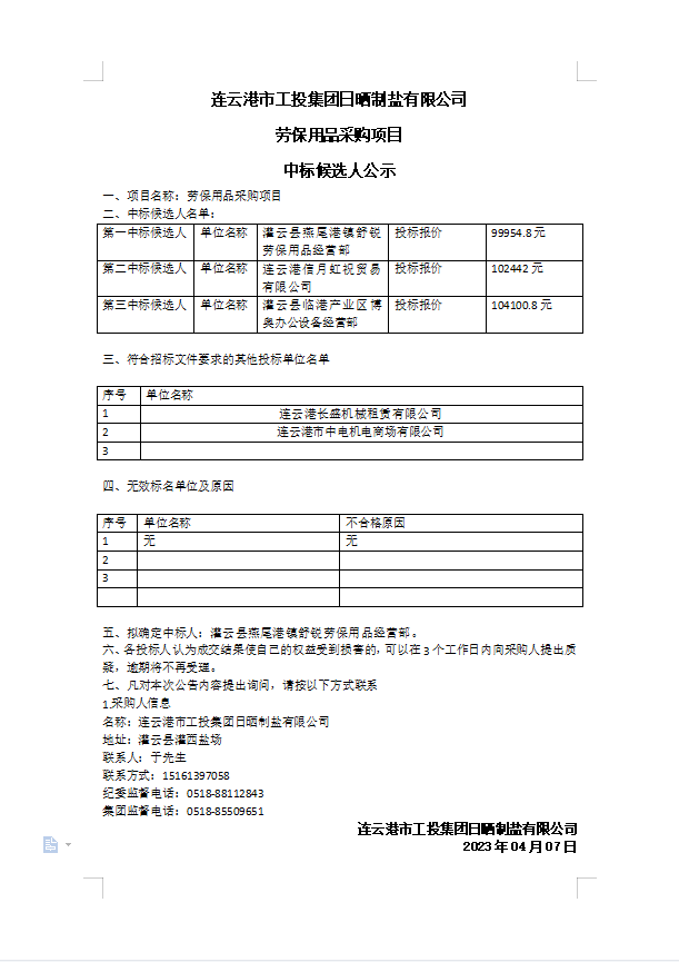 连云港市工投华体会(中国)日晒制盐有限公司劳保用品采购项目