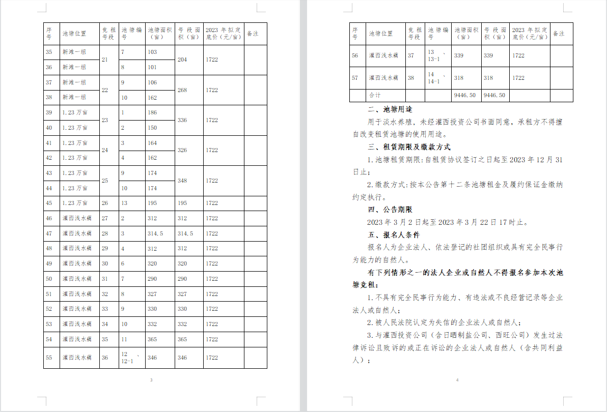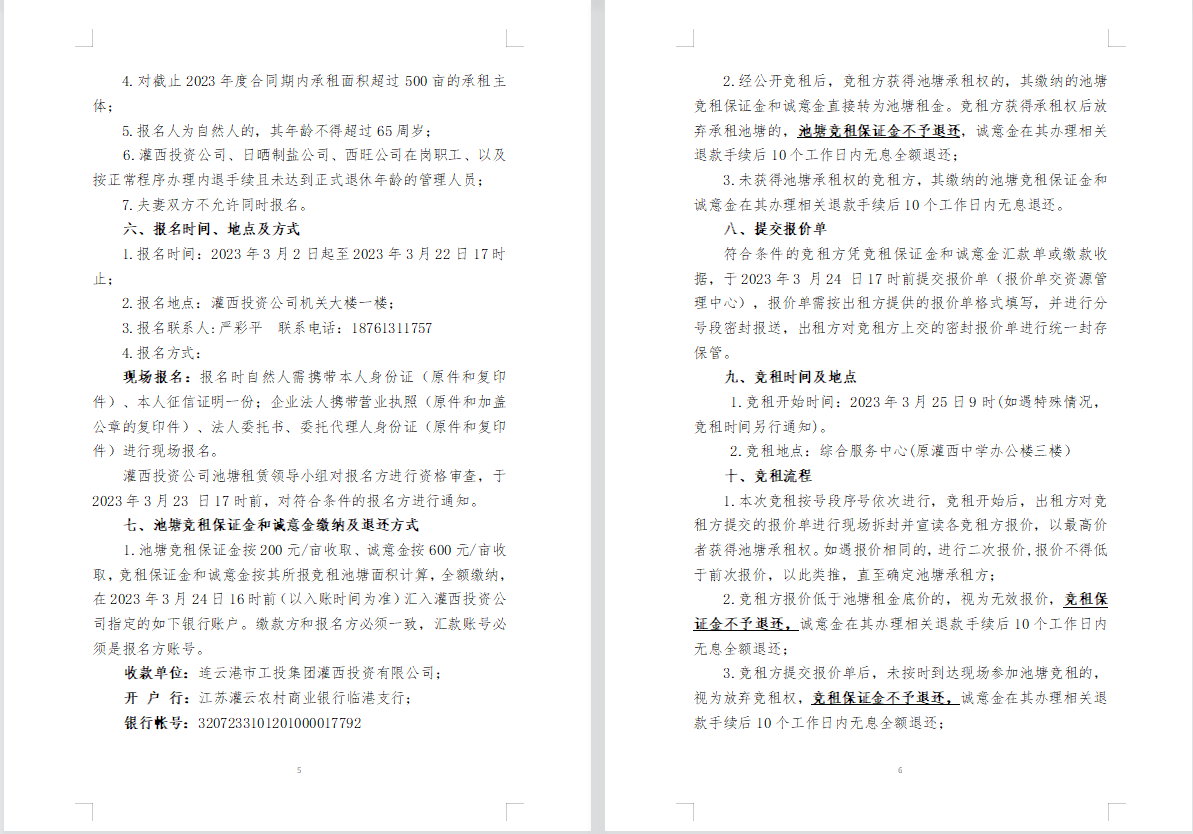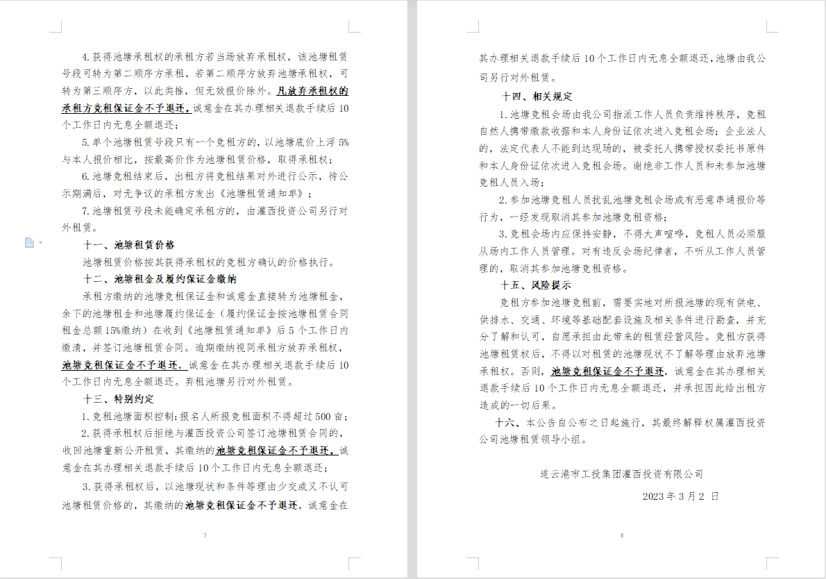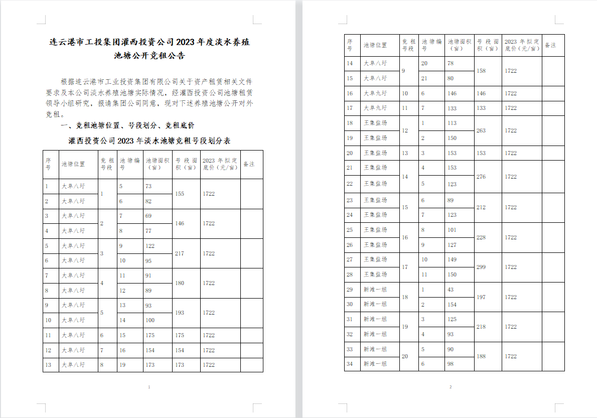 连云港市工投华体会(中国)灌西投资公司2023年度淡水养殖池塘公开竞租公告