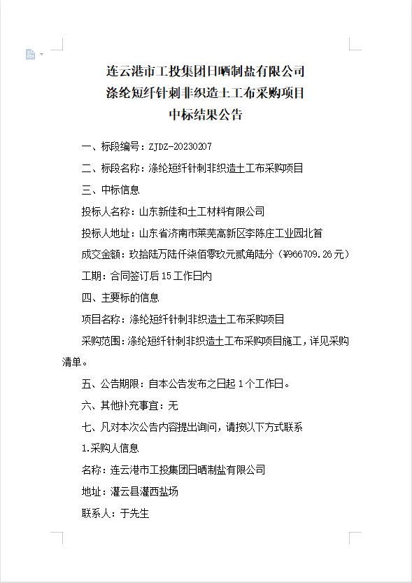 连云港市工投华体会(中国)日晒制盐有限公司涤纶短纤针刺非织造土工布采购项目中标结果公告