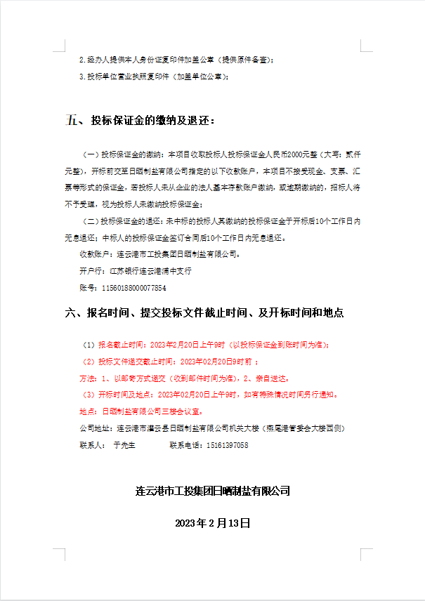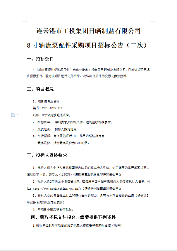 连云港市工投华体会(中国)日晒制盐有限公司8寸轴流泵配件采购项目招标公告(二次)