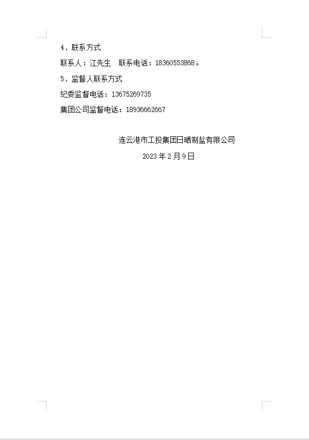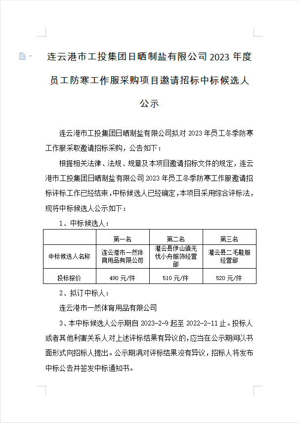 连云港市工投华体会(中国)日晒制盐有限公司2023年度员工防寒工作服采购项目邀请招标中标候选人公示