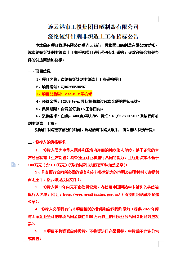 连云港市工投华体会(中国)日晒制盐有限公司涤纶短纤针刺非织造土工布招标公告