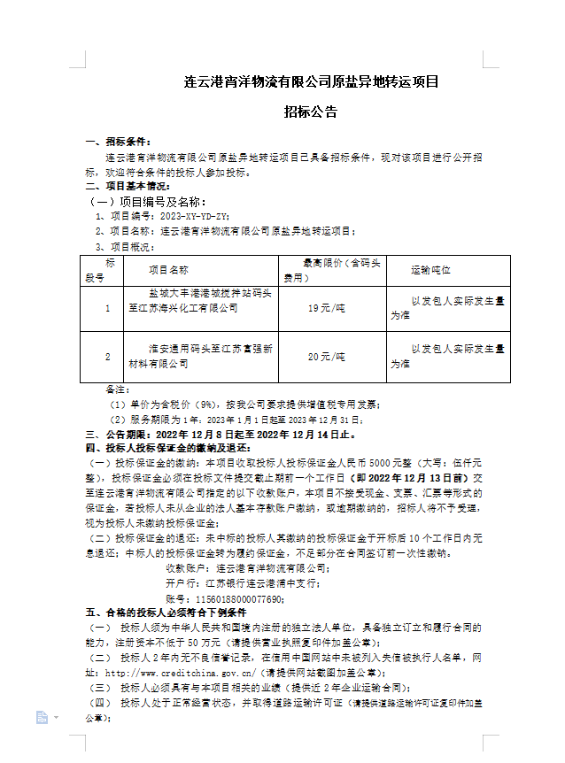 连云港宵洋物流有限公司原盐异地转运项目招标公告