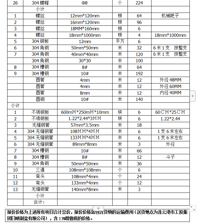 单价(含13%税、运输费用)。合同期间304不锈钢单价不以304不锈钢市场单价的变动而作任何调整。