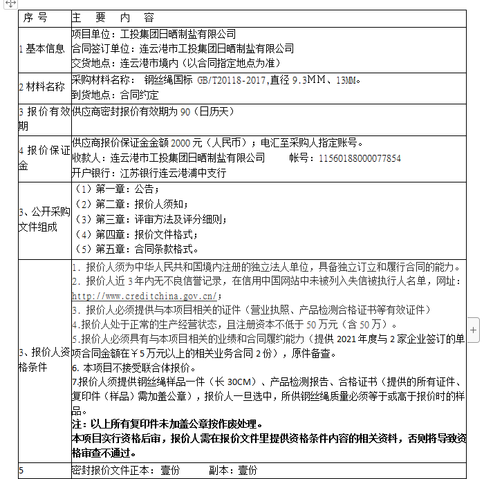 钢丝绳公开采购公告
