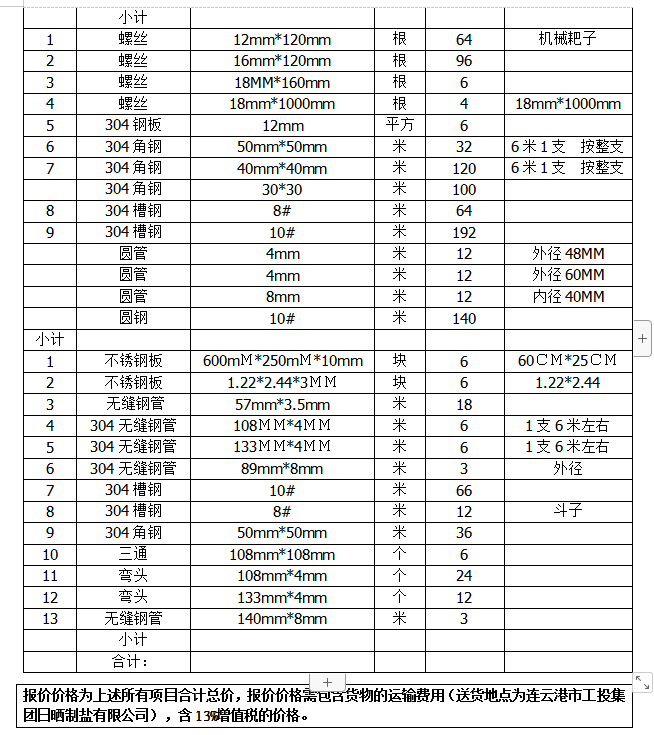 单价(含13%税、运输费用)。合同期间304不锈钢单价不以304不锈钢市场单价的变动而作任何调整。
