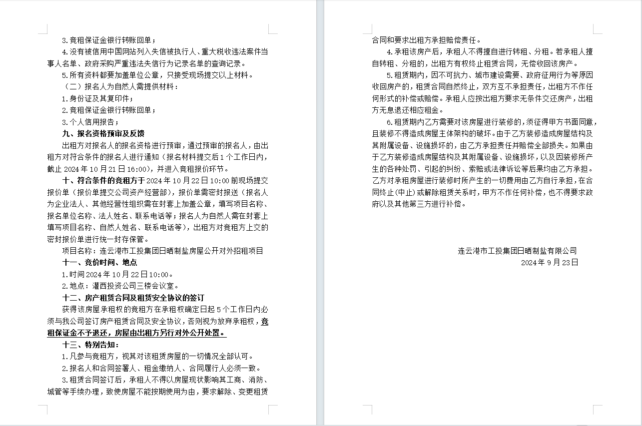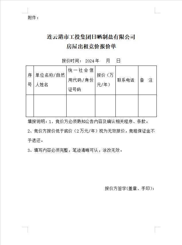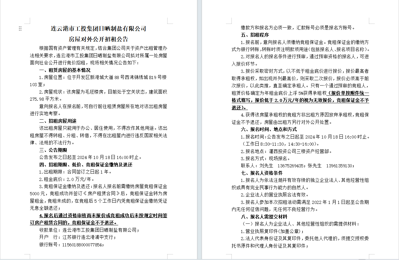 连云港市工投华体会(中国)日晒制盐有限公司 房屋对外公开招租公告