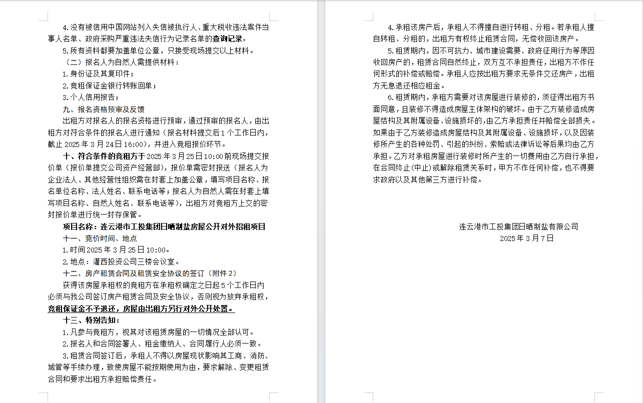 连云港市工投华体会(中国)日晒制盐有限公司房屋对外公开招租公告