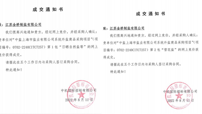 近日,我公司以网上竞价的方式,成功中标中盐上海市盐业有限公司系统外盐商品2022-2023年度采购项目,标的量1.5万余吨。