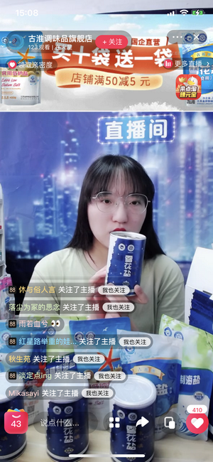 下午3:00,直播正式开始。主播通过网络平台向粉丝们在线介绍了金桥制盐数款产品,其中包括雪花盐、低钠盐、日晒海盐等诸多品种,与粉丝分享淮盐文化和知识。在首场直播中,近1000多名粉丝走进直播间围观、点赞和下单心仪产品。