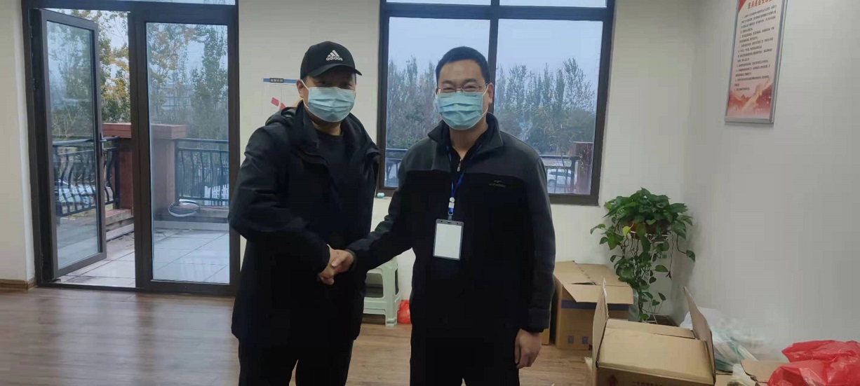 连云港市新浦街道新桥社区党委书记史建国握着资产公司党支部副书记王顺友的手说“感谢工投志愿者为社区疫情阻击战所做的巨大贡献”。