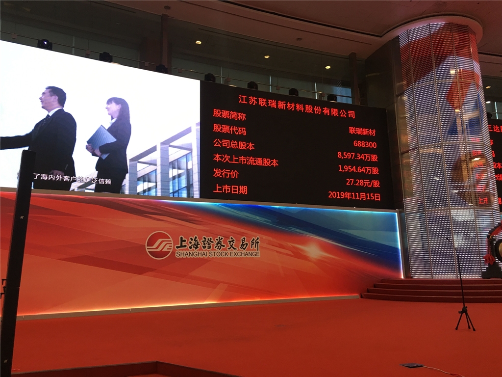 | 11月15日上午9时30分,工投华体会(中国)产业基金投资企业——江苏联瑞新材料股份有限公司(以下简称“联瑞新材料”)首次公开发行A股上市仪式于上海证券交易所举行。华体会(中国)公司党委书记、董事长杨龙,资产管理公司有关人员受邀出席仪式。