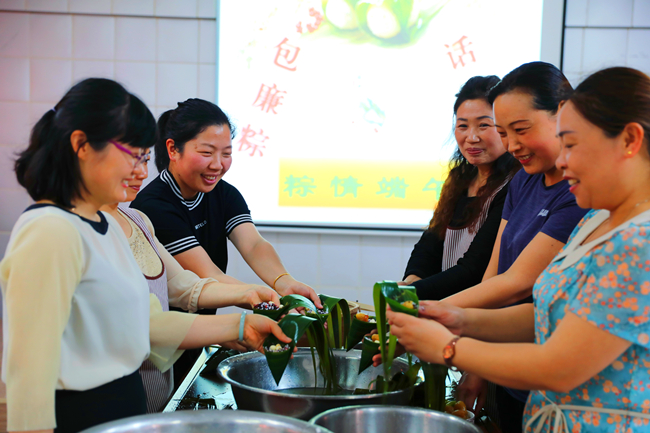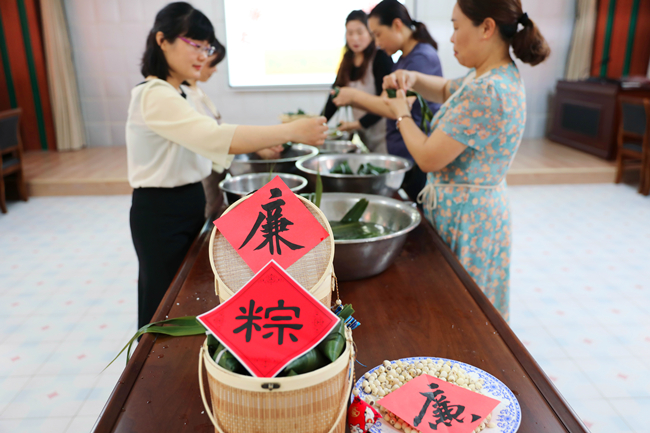 在活动现场,桌子上摆满了碧青粽叶、黑白糯米、红豆大枣、白色莲子,烘托出浓厚的节日气氛。大家欢聚一堂、欢声笑语,在传统文化中感受廉洁元素,一边聊着家常,一边包着粽子,先是选好“青”廉衣,然后放入提前泡好的 “莲”心馅,最后系紧“廉洁绳”,不一会,一个个碧绿飘香、形状各异“廉心粽”就包好了,被整齐地摆放在竹篮中。纪委书记朱文兵说:“廉心粽蕴含着清正廉洁的美好寓意,组织大家亲手包廉粽,是希望大家能够把‘廉’带回家,在品尝美味廉粽的同时,还要时刻绷紧廉洁弦,做到守廉洁、过廉节”。