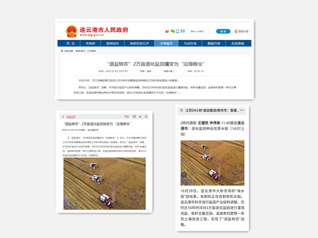 今年收割期间,人民网、光明网、江苏24小时、连云港市人民政府网、连云港日报连续报道了我公司盐碱地水稻丰收、秸秆综合利用等工作举措。我公司在现代农业发展和生态文明建设中取得的成就受到了媒体广泛关注。(青宣)