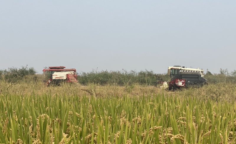 10月13日,大新农场50余亩稻花香水稻迎来成熟期,开镰收割。在金色的稻田里,稻谷随着秋风翻起波浪,空气中裹挟着稻米的清香。轰隆隆的收割机来回穿梭在稻田之中“作画”,眼前呈现出一派秋收的忙碌景象。(王璐)