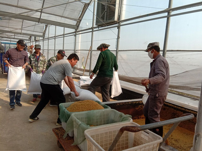 近日,生态种养中心大棚育秧正式开始,全体人员迅速投入工作状态,运送秧盘,调试育秧播种设备,浸泡稻种等工作有序进行,据统计,今年大棚暗化育秧6万余盘,5月5日左右完成,确保严格按照“3个20”计划保障农时。(严鑫)