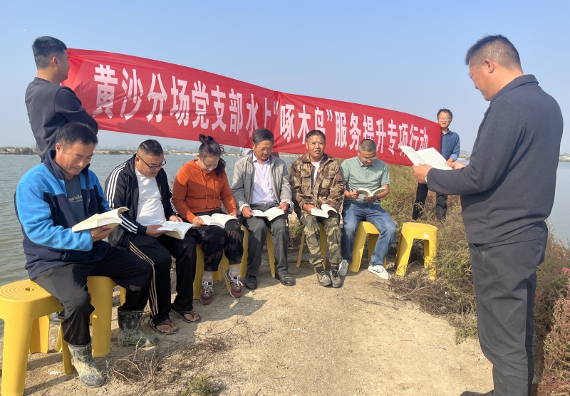 近日,黄沙分场党支部开展水上“啄木鸟”服务提升行动,组织养殖户党员和技术能手聚在塘头学习党的二十大报告,开展养殖技术培训和生产服务,切实打通党建引领、服务养殖的“快速通道”。(卢伯斌)
