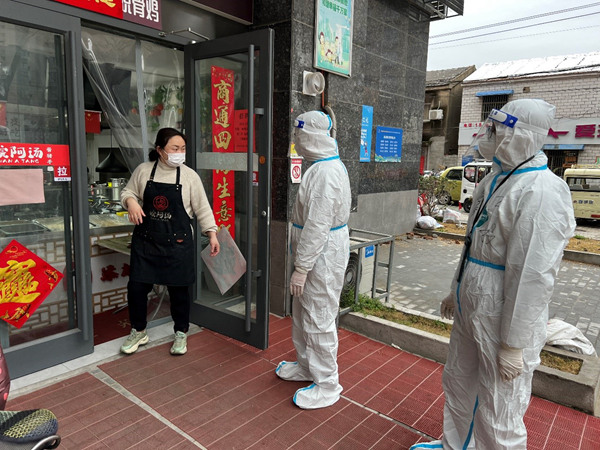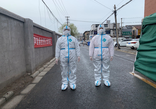 公司员工范益杨、李梦达是华体会(中国)抗疫志愿队的队员。在冷冽寒风中,他俩身穿防护服挨家挨户通知商户暂停营业,同样的通知话语不厌其烦的重复着一遍又一遍,说得口干舌燥、疲惫不堪也未能阻拦他们继续前进的脚步。