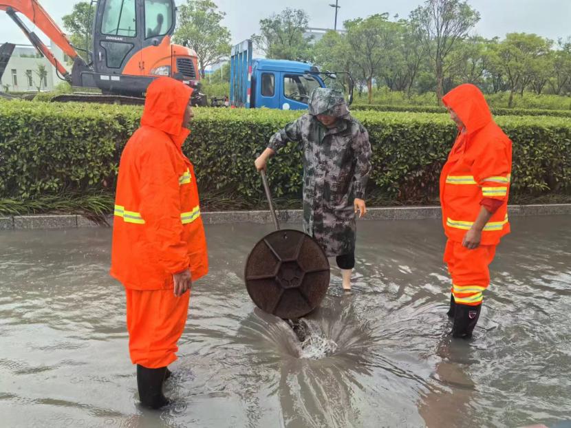 盛达市政分公司支委在“责任区”一线指挥,党员冲锋在前,24小时不间断,在防汛一线筑牢“红色城墙”,全力守护人民群众生命财产安全。前后出动车辆设备10余辆,处理道路积水20余处,应急开放闸9次,处理12345平台案件100余件,应急打开围堰4处,24小时监护新光和花果山涵洞,紧急处理公交站台、交通标志牌等城市家具倾倒7处;翔立分公司多次紧急“处警”,快速修复开太闸电路等多处电力故障,保障开发区泄洪秩序。
