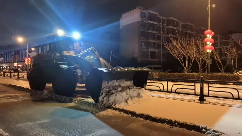 当晚,按照“即下即清、先通后净、保障通行”的清雪除冰原则,在统一调度下,一台台清雪设备有序穿行于道路上,撒布机打头阵,推雪板车紧随其后,将路面积雪进行打通,地上的雪从前向后逐次被清雪车辆推向道路边缘。随后,由人工加以配合,在人机结合方式下,冰雪被装到车上清运走。