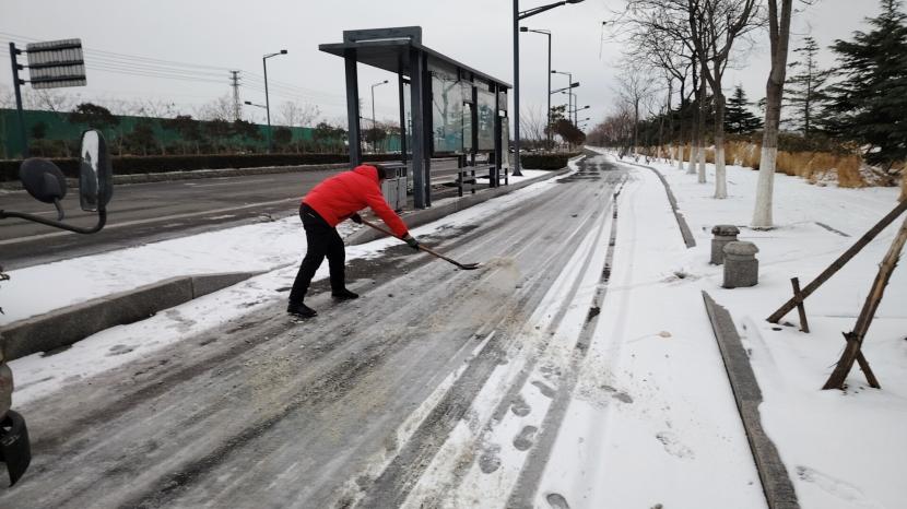自2月2日以来,裕升养护分公司接到扫雪除冰紧急通知后积极响应,迅速调配人员和物资,等待暴雪降临。在负责人霍正钢的带领下,公司第一时间成立应急抢险队,这是一支由12名队员,平均年龄在57岁所组成的队伍,更是一支“特别能吃苦、特别能奉献、特别能担当”的队伍。雪花于晚次日11点飘然而至,霍正钢密切关注雪量以及积雪状况,并做好指挥部署,同时通知各队员立即开展道路扫雪除冰工作。