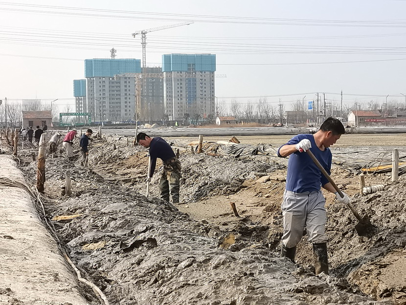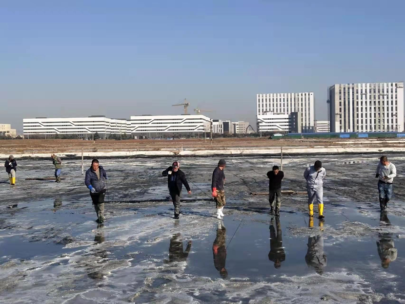 矿盐复产项目部,聘请日晒制盐专家王绪前进行工艺指导,聘请劳模朱春年带领团队攻坚。复产战役从2021年12月就打响了,春节的时候,他们仅休了三天假,大年初三全部到岗,一锹一锹挖泥通沟,一条一条池堰加高整平,一块一块盐田清理压实......到2月,他们硬是把征地后废弃许久的盐田和边角地整理成矿盐基地,结晶池面积达1950公亩,达产可产原盐20000吨。