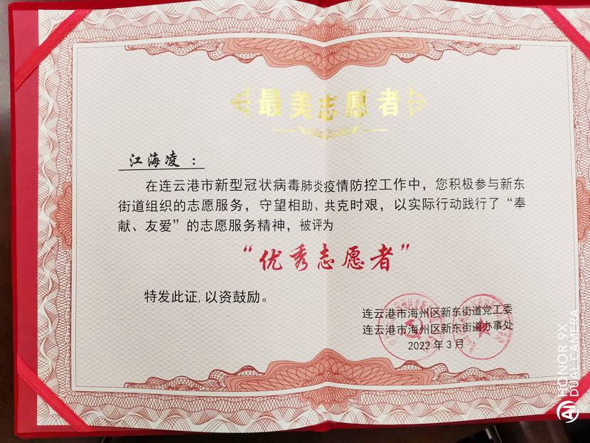 新东街道党工委、新东街道办事处联合为荣誉获得者颁发纪念证书,同时予以表扬,新东街道提到:市工投华体会(中国)台北投资公司党员江海凌同志最肯吃苦,最能战斗。他每天早上到的比谁都早,晚上回的比谁都晚,与社区工作人员一道进楼入户排查信息,仔细询问居民生活物品需求情况并予以解决,还认真参与卡点防控值守、小区巡逻、做好小区出入人员体温检测、登记消杀出入车辆等一线工作。在疫情最后阶段,大部分志愿者撤离,江海凌仍在“逆行”,成为小区居民物资保障志愿者,每天为广大居民“菜篮子”保驾护航,江海凌是勇于担当的逆行者,是最美志愿者。
