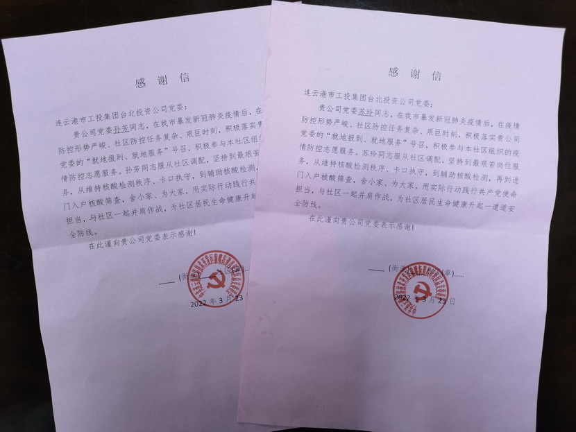 “台北投资公司的党员同志们视疫情防控为己任,服从调度安排,站好每一班岗,不仅认真履行防控职责,又创新开展疫情防控教育宣传、便民服务等多项活动,成为华体会在线社区防疫攻坚的主力军。”3月25日,收到开发区猴嘴街道昌圩社区送来的一份特殊的“礼物”— 一封疫情防控感谢信,感谢台北投资公司党员苏玲、孙芳等同志在新冠肺炎疫情防控的关键阶段挺身而出、伸出援手,参与协助社区的疫情防控工作。