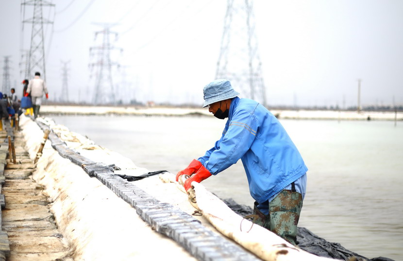 首先来到海州湾公司大浦班组。这里是公司矿卤复产工作重点班组,职工们正在整理结晶池、抢修塑苫布。据海州湾公司负责人刘天义现场介绍,由于前期审批、采购等原因,加之突发的新冠肺炎疫情,结晶池塑苫布没能及时更新,预报25日有明显降雨过程,海州湾广大职工因地制宜,收旧利废,积极备战大雨天时。