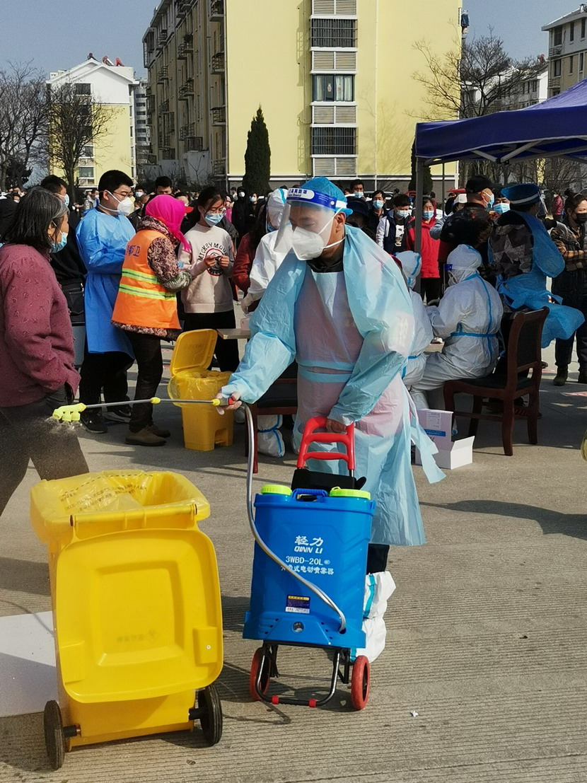 ▲昌圩社区临时党支部组织委员霍正钢今天担当环境消杀员
