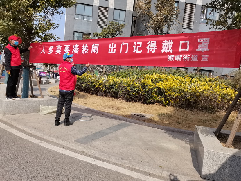 ▲昌圩社区临时党支部书记李明,党员骨干于洪亮悬挂疫情宣传标语。