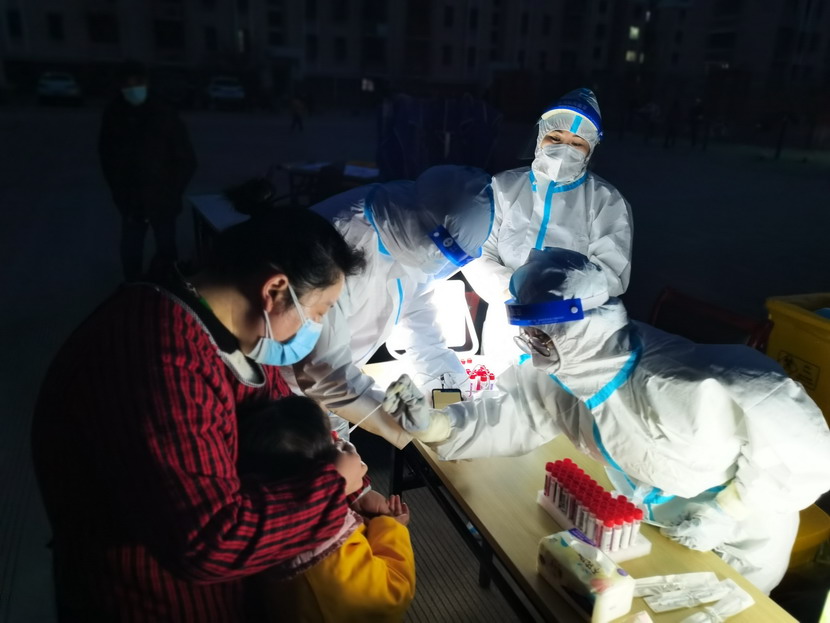 ▲昌圩社区临时党支部党员志愿者与医护人员一起工作到深夜