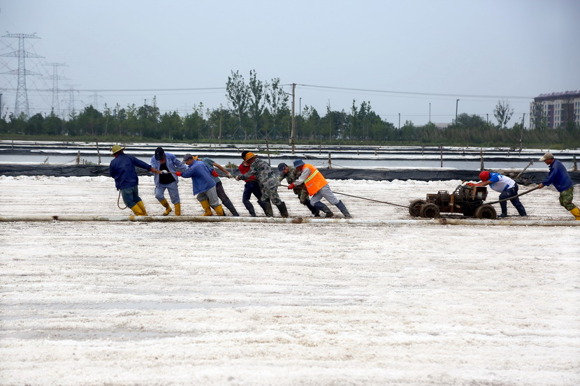 今年以来,针对政府征地、碱厂关停的现实,投资公司积极推进生产方式变革,打破一年两季固有收盐模式,实现原盐随用随收。在海州湾先锋东滩扒盐一线,王德志仔细观看了作业情况,现场收盐职工正在进行挪机工作。