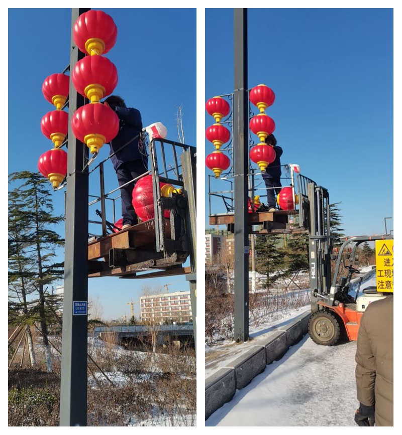 “亮华港城”。近期的一场大雪不仅给港城披上一件银装,也将花果山大道两旁的路灯和灯笼刮落损坏。翔立铁军放弃休息奋战在修复灯笼工程一线,保障了人民群众的出行安全。