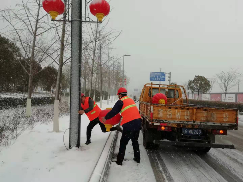 一夜的狂风暴雪将花果山大道路上的亮化灯笼刮掉不少,该项工程是翔立分公司今年承接开发区市政第一个亮化工程,安装维护质量的好坏决定着这该项目工程的能否持续承接。带着一份坚守、心怀责任、更带着翔立转型发展的希望,“铁军”们一大早就已经整装待发,奔赴施工现场收集整理灯笼。