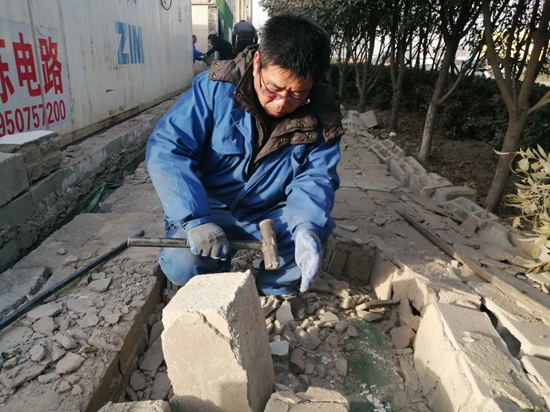 据悉,该处墙头整体倒塌,大多数砖块没有受到损坏。志愿者们一块一块的挑选、清理、搬运,将可以回收利用的砖块整理好,用于墙头的修葺。水泥、沙的配比不太熟悉,天气寒冷如何做好防冻,怎么办?临达公司的退休老党员主动站了出来,为围墙修葺工作做指导,提供帮助。经过两天的奋战,将倒塌的墙头修葺好,并拉好了美化绿布。