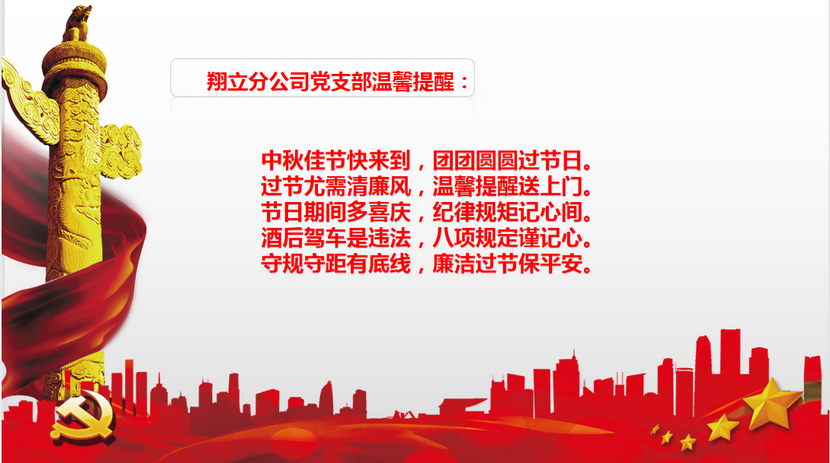 为筑牢廉政“防火墙”,确保佳节期间风清气正,9月5日,翔立分公司党支部通过微信向全体党员干部职工发送廉洁小短信,提醒全体职工拒腐戒奢,廉洁过节。