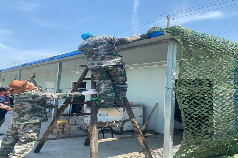公司从上至下全员上阵,在烈日下穿着闷热的防护服埋头苦干,为中小企业园临时用房穿上了“绿衣”也为港城环境多增添一抹盎然。