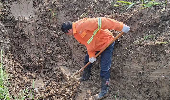 市政分公司组织抢修人员迅速到场,调集挖机与抢修材料,有序开展应急抢修。维修人员首先对漏水管道实施开挖,经过维修人员仔细挖开后确定直径110PVC管道老化导致管道连接端裂开。查明原因后,制定了相应可行的抢修方案。抢修过程中,大伙不畏困难、分工有序,相互协作,在满是泥泞的坑中开展维修作业。机械开挖、人工配合清淤、更换损坏管道、增设哈夫节等一系列的步骤,一通操作下来,抢修人员人人汗流浃背。经过3个多小时连续奋战,高效完成此次抢修任务。