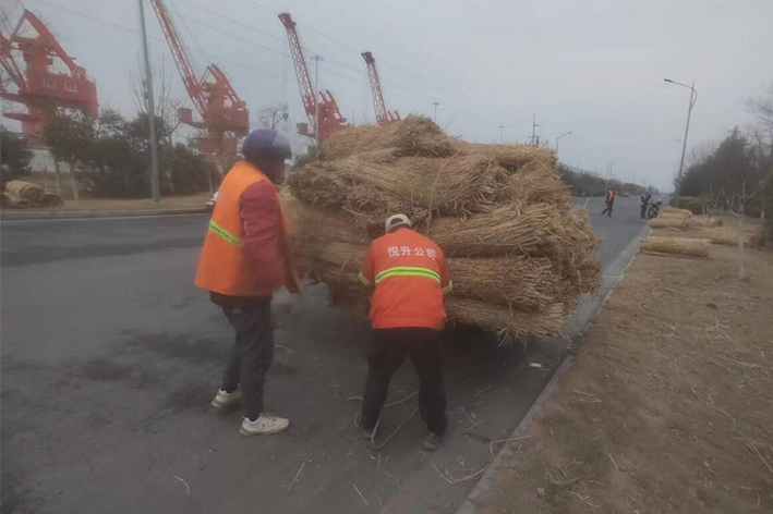 实时拆除防寒设施。随着气温的逐渐升高,为使苗木更好、更快的返青,前期瑞南二个绿化班组紧锣密鼓,积极准备,抢抓时机,3月中旬对云港路、金港路、228等道路两侧夹竹桃等绿植防寒草帘进行拆除工作,并对去冬枯枝干叶安排修剪。