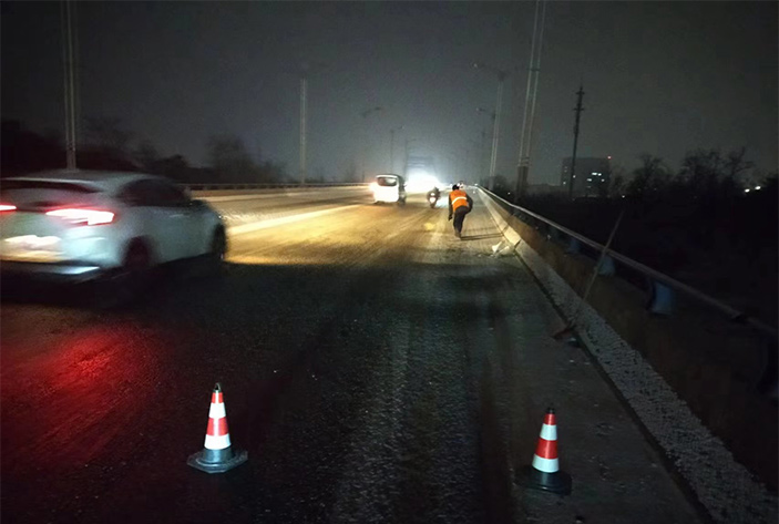 该公司除雪突击队由总经理徐习华和副总王利分头带队指挥,集结了安全部、管养部、绿化、保洁、市政、环卫的突击队员80余名,出动5辆皮卡车、3辆皮卡、1台装载机和2辆巡查车,主要负责新区内桥梁、连云开发区桥梁、徐新路、疏港大道、228省道等主要交通干道布撒融雪剂抗冻救灾工作。突击队员在进行融雪剂撒布作业的同时,及时清理路面融化雪水,防止再次结冰,各除雪设备配合作业,阶梯式向前推进,提高除雪效率。(李敏 王宜全)