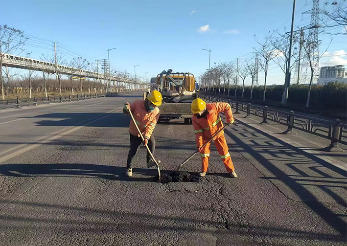 受近期冬季雨雪冰冻天气影响,徐圩新区部分道路出现沥青路面破损、龟裂等现象严重,坑洼的路面不仅影响道路通行安全,也影响了城区形象。为防止路面坑槽及延伸病害的快速发展,近日,市政分公司及时组织两班人马,10名道路养护人员,加班加点对新区破损沥青路面进行全面修补。