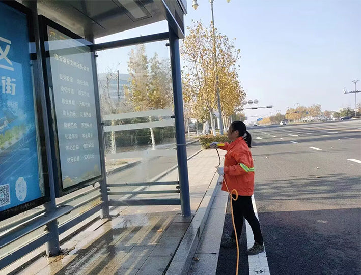 该分公司百余名一线保洁人员,无惧徐圩初冬低温天气,道路两侧,公交站台,三人一组,两人一对在班长带动下,挥动手中大扫把,上下摆动拖把,人工清扫辅道落叶2000多米长,清洗站台30多个,徒手擦洗座椅60多个,清倒果皮箱200多个;突击转运园区施工垃圾300袋,有力保障途经道路环境整洁靓丽;大型车辆整装待发,持续三天加班加点,7时许准时加满车厢用水,安全有序到达指定路段,20台大中型清扫冲洗车辆作业台班达4个以上,为成功完成此次大保障有力彰显机械强大功能。