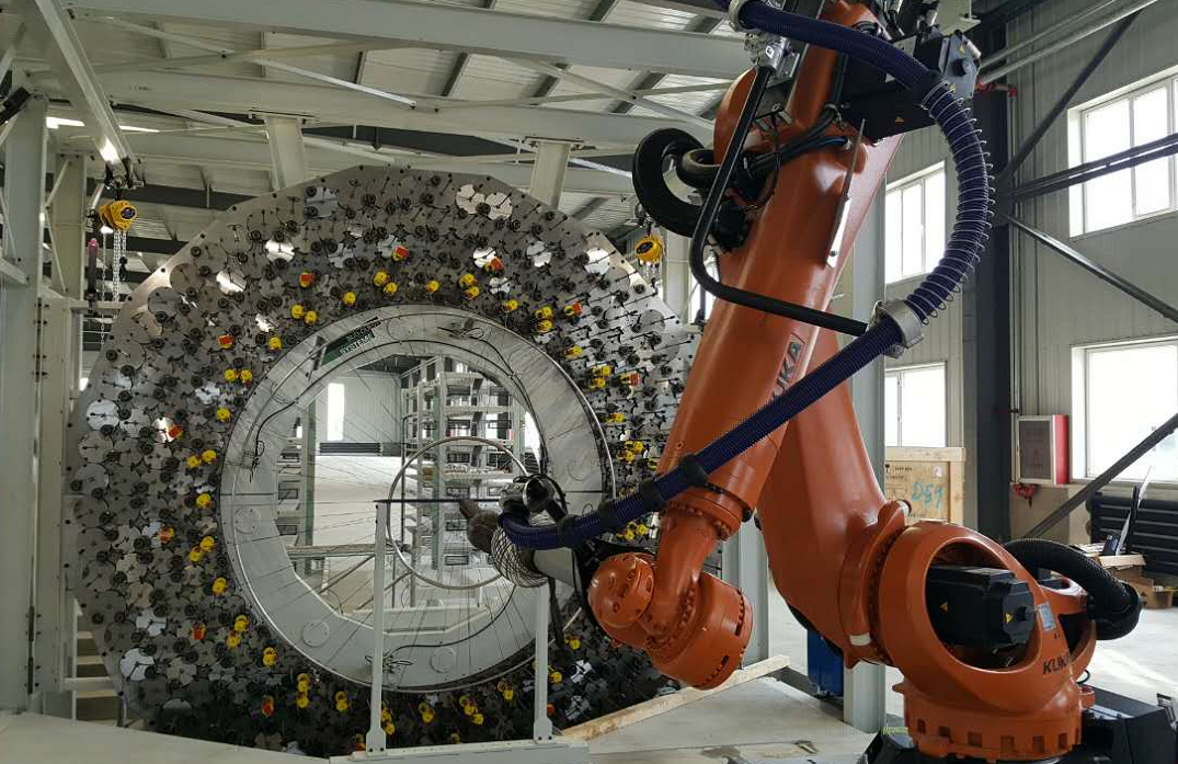 采用大规模机械臂装置,通过控制面板输入编织程序,自动完成对碳纤维、芳纶纤维等高性...